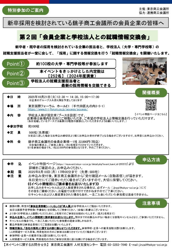 東京商工会議所との連携事業のご案内です。 2025年度 第2回 「会員企業と学校法人との就職情報交換会」のお知らせ